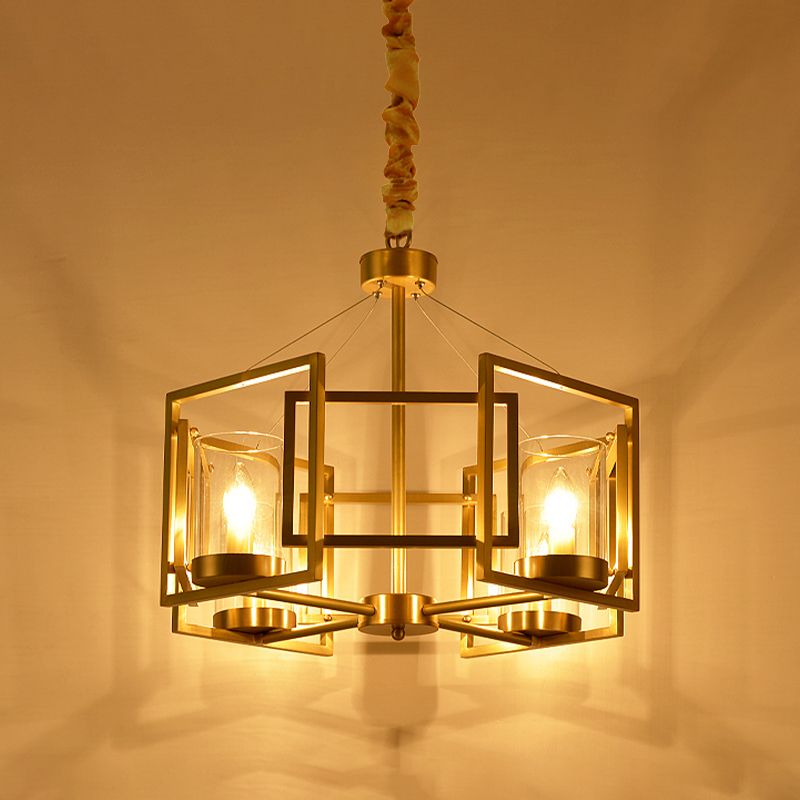 Luxury Cylinder Chandelier Pendant Light 4/6-Head Clear Glass Hanging Lamp in Gold with Rectangle Metal Cage