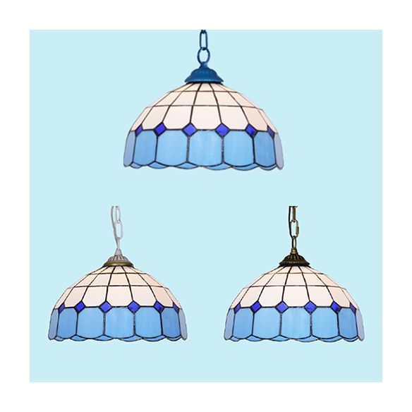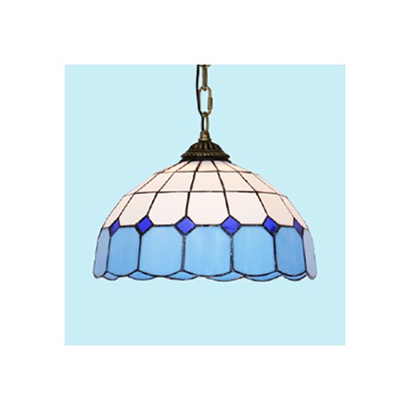 Mediterranean Dome Hanging Light Stained Art Glass 1 Bulb Pendant Light Fixture in White/Blue/Bronze