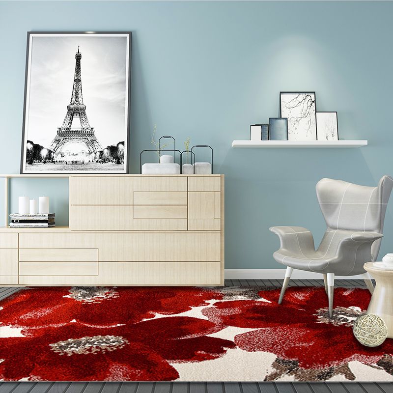 Red French Country Rug Polyester Floral Pattern Rug Washable Non-Slip Backing Carpet for Living Room