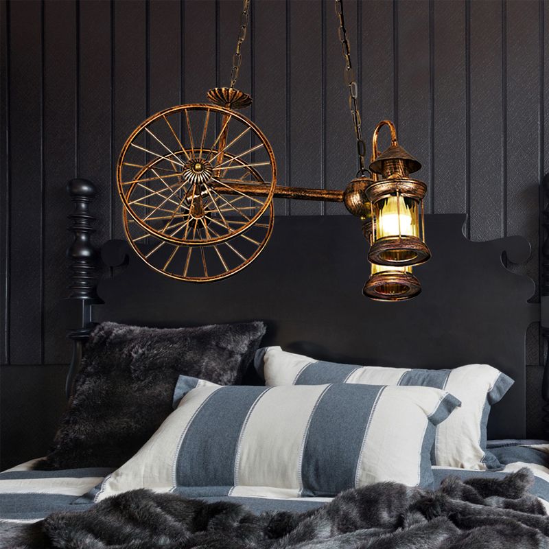 Rustic Stylish Wheel Design Hanging Lamp with Lantern Shade 2 Lights Metal Chandelier Lighting in Brass
