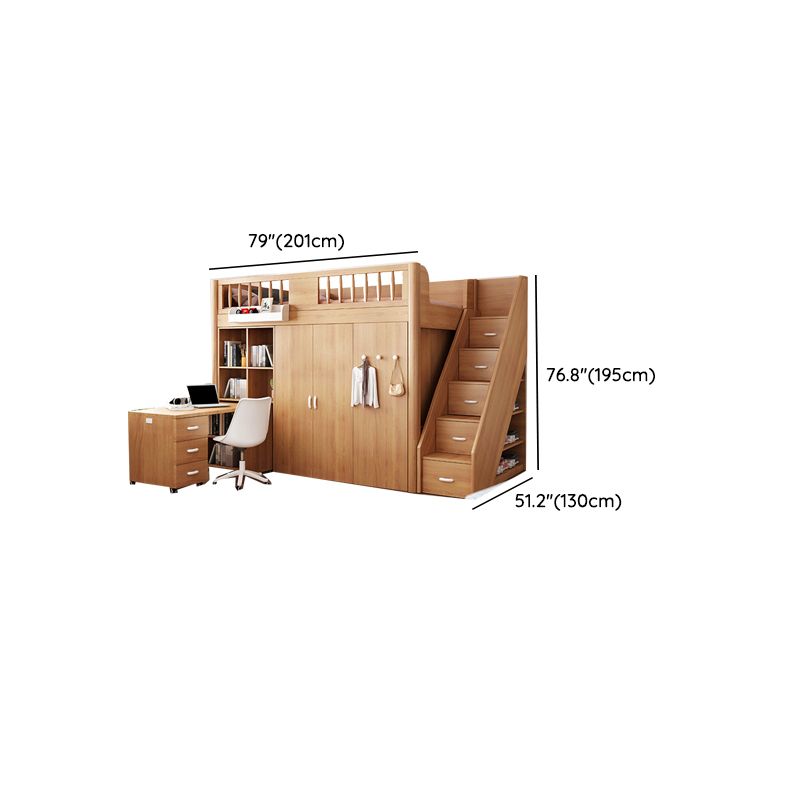 Scandinavian Wood High Loft Bed Natural Bunk Bed with Stairway and Storage