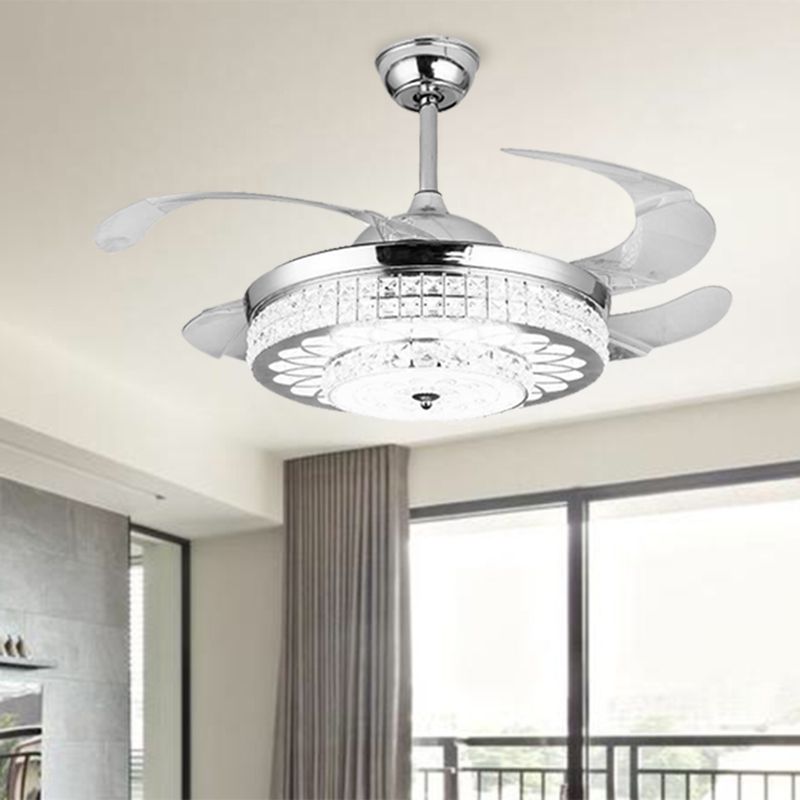 Silver/Gold 2-Tier LED Downrod Ceiling Fan Modernist 4-Blade Faceted Crystal Hanging Lamp with Wall Control/Remote Control/Frequency Conversion