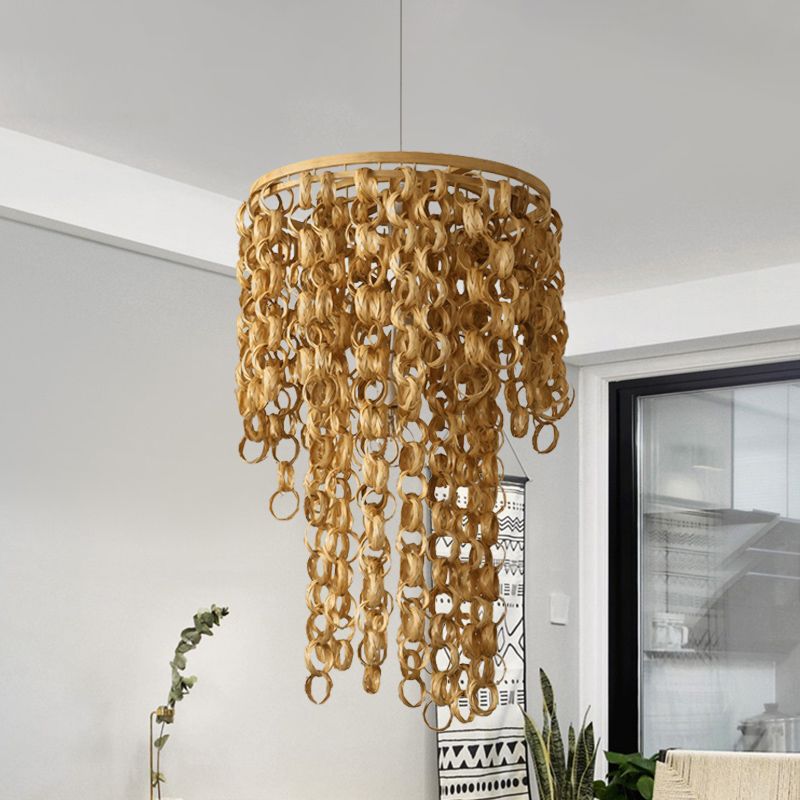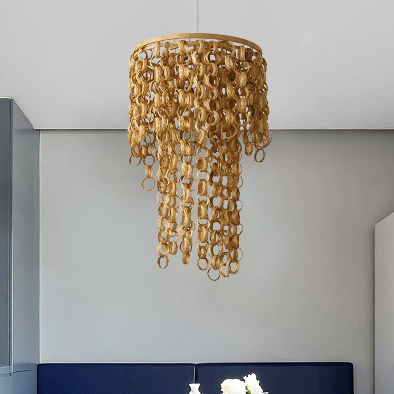 Square/Round Hanging Light with Waterfall Design Asia Bamboo Rattan 2-Bulb Beige Chandelier Pendant Lamp