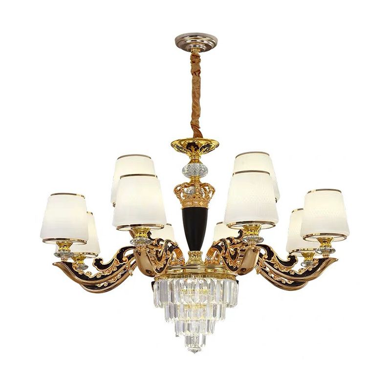 White Glass Tapered Ceiling Lighting Traditional Living Room Chandelier Light with Layered Crystal Decor