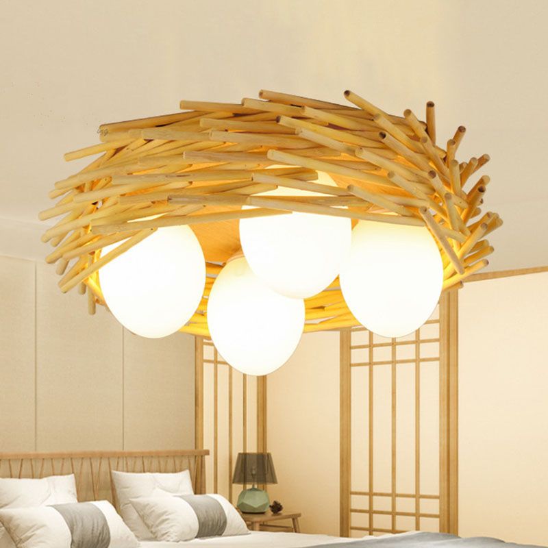 Wood Bird Nest Ceiling Chandelier Asian Bamboo Hanging Pendant Light with Egg Opal Glass Shade