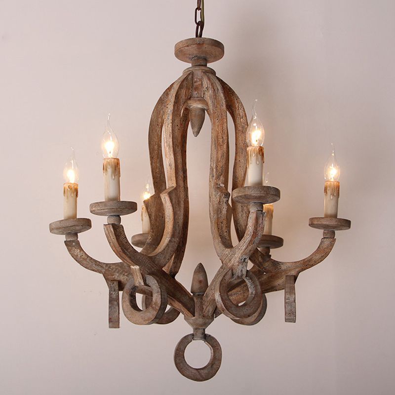 Wooden Candlestick Chandelier Pendant Light Vintage 6 Bulbs Living Room Hanging Light