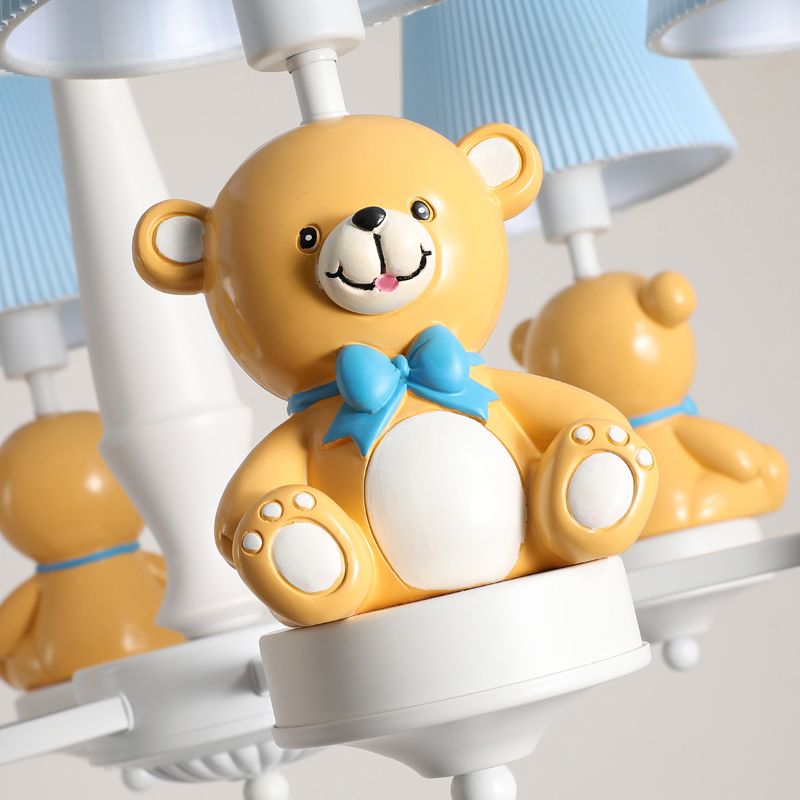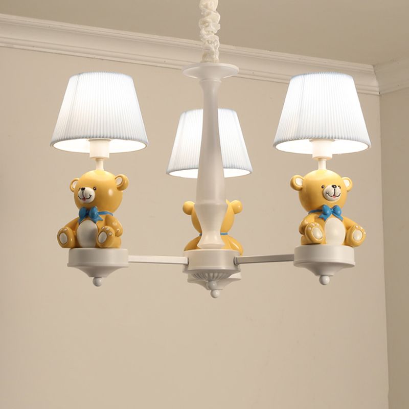 Yellow Bear Toy Chandelier Cartoon Resin Suspension Light with Tapered Gathered Fabric Shade