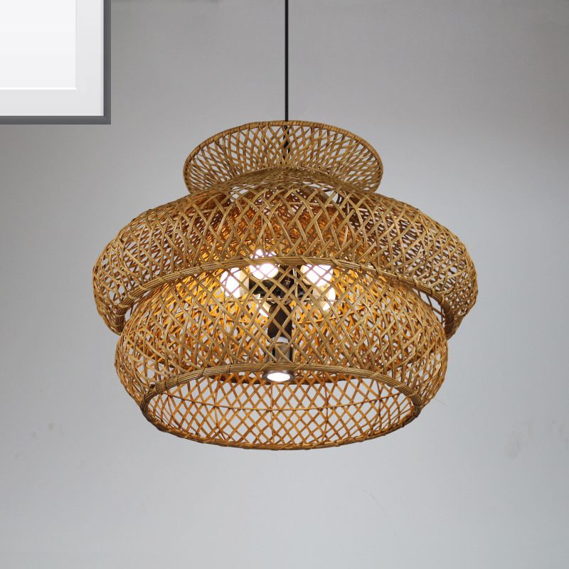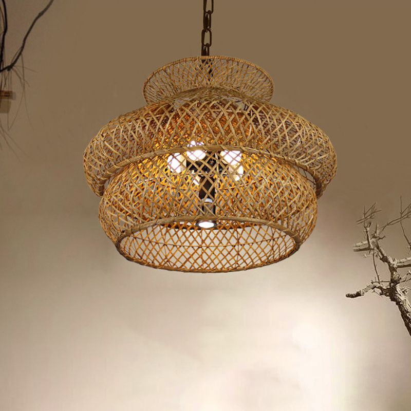 2-Layer Suspension Pendant Retro Bamboo LED Wood Hanging Light Kit for Restaurant