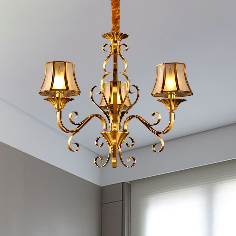 Curved Arm Metal Ceiling Chandelier Colonialism 3/5/6 Heads Living Room Suspension Lamp in Gold with Beige Frosted Glass Bell Shade