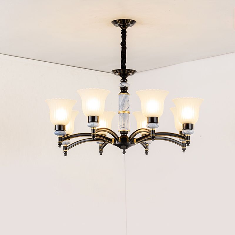 Ribbed Frosted Glass Flared Chandelier Vintage Bedroom Pendant Light with Scalloped Edge in Black