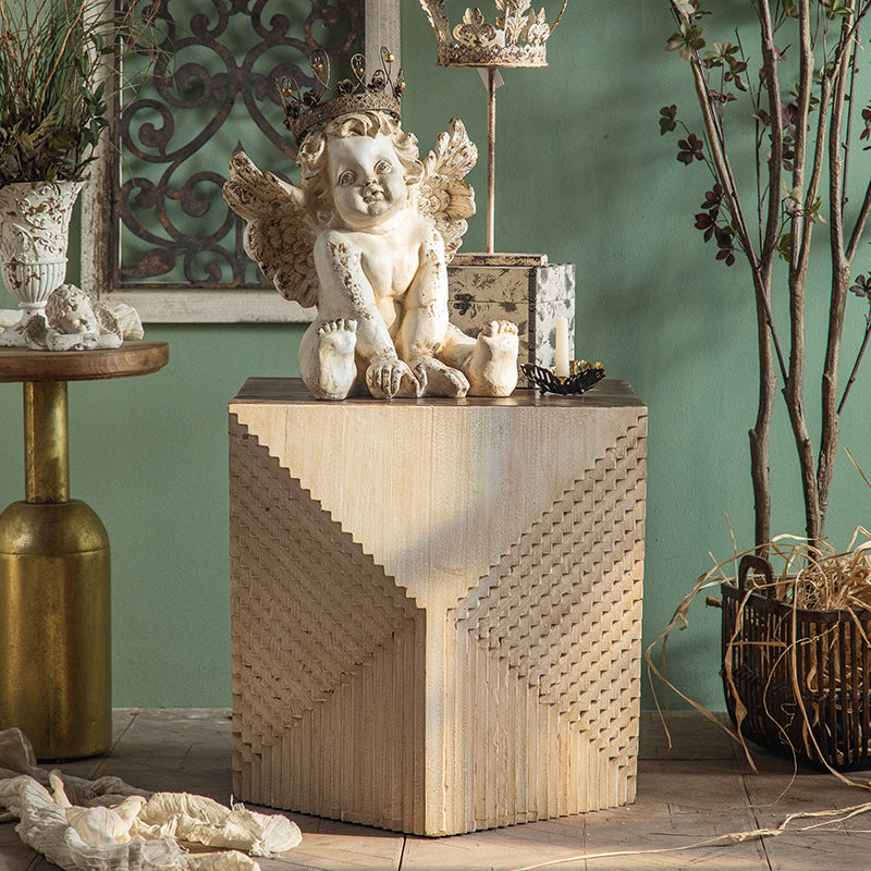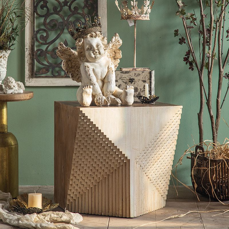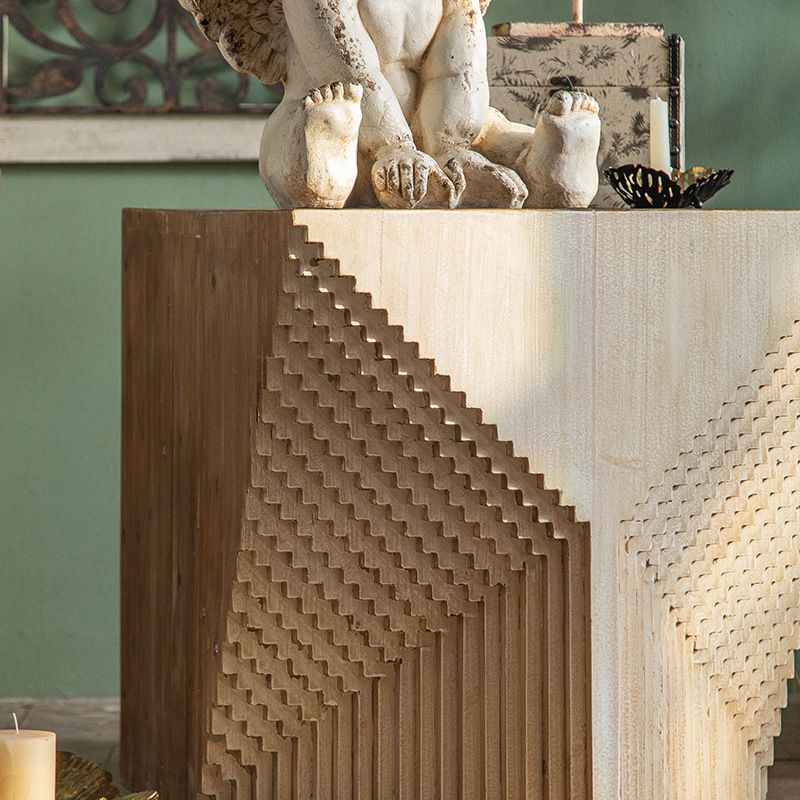 Solid Wood Drum End Table Rustic Engraved Design Accent Side Table